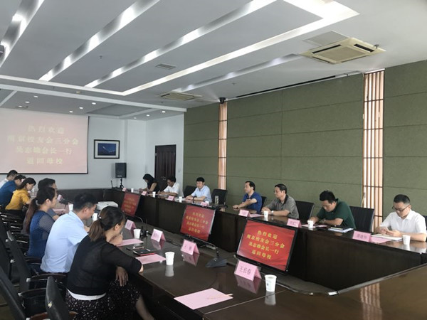 9月20日上午,南京校友会三分会会长吴志雄一行来母校交流。学校党委书记、校友会会长吴学敏,校友会常务副会长尤建国,以及党政办、宣传部、学工处、计财处等部门负责同志参加了交流。