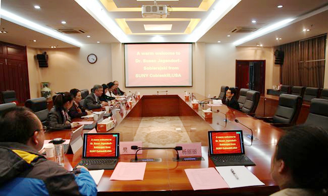 10月23日,美国纽约州立大学科贝尔斯基尔学院国际部主任苏珊女士(Ms.Susan Jagendorf-Sobierajski)来万搏网页版访问,总督学卢兵热情接待了客人,双方就两校合作事宜进行了洽谈。国际合作与交流处、国际教育学院、商务贸易学院相关负责同志和团队老师参加了接待。
