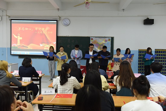 本次活动共分为五个环节:第一个环节,值此新中国成立70周年之际,为表达师生对伟大祖国的热爱,由党员教师代表马刚、沈秀梅、严潇睿三位老师与5位学生代表一起朗诵了《从我心底深爱我的祖国》,师生们用最深情的声音表达对祖国的热爱。第二个环节,党员教师以“初心是什么,使命干什么,奋斗比什么”为专题,每个人结合自己的岗位阐述了如何践行他们所守的教师初心。樊群老师的“爱校如家”、张家颖老师的“师生情谊爱相连”、张莹老师的“立德树人”、夏楠老师的“学高为师,身正为范”、戴小清老师的“培养有理想有追求有担当的大学生”、马刚老师的“敬业乐群”、沈秀梅老师的“爱生如子”、严潇睿老师的“以学生为本、开启心灵之门”、张芹老师的“师者,传道授业解惑”和李国彦老师的“信任、宽容、欣赏、创造”等等都是各位老师对于自己教育事业初心的总结和归纳。陈林杰书记也给大家分享了他的初心、使命和奋斗目标。同时也告诫大家工作不能只停留在口号上,一定要在工作中努力践行,为国家培养更多高技能人才。第三个环节,猜红歌比赛。党员教师和学生共分为五组,由主持人现场随机播放18首红色歌曲,现场选手抢答歌曲名称正确即而得分,最后根据每组累计得分评选出了一二三等奖。第四个环节,全体师生励志报效祖国。全体师生分别在彩色便签纸上写下了自己将如何通过实际行动来回报祖国母亲,并将自己立下的誓言贴到了中国地图上的每个角落。第五个环节,全体师生高声齐唱《我和我的祖国》。大家手握鲜艳的五星红旗,通过热情洋溢的歌声,表达了大家对祖国母亲的热爱和祝福,同时也将现场活动氛围推向了最高潮。
